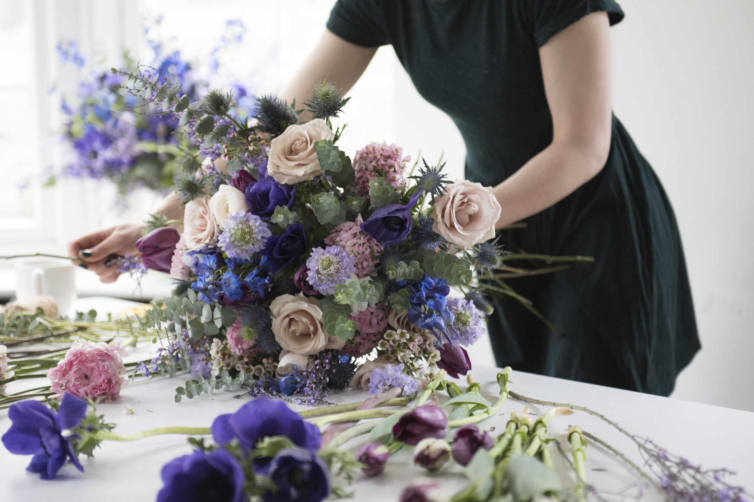 A soft and subtle arrangement of white orchids, lilies, and silver eucalyptus.