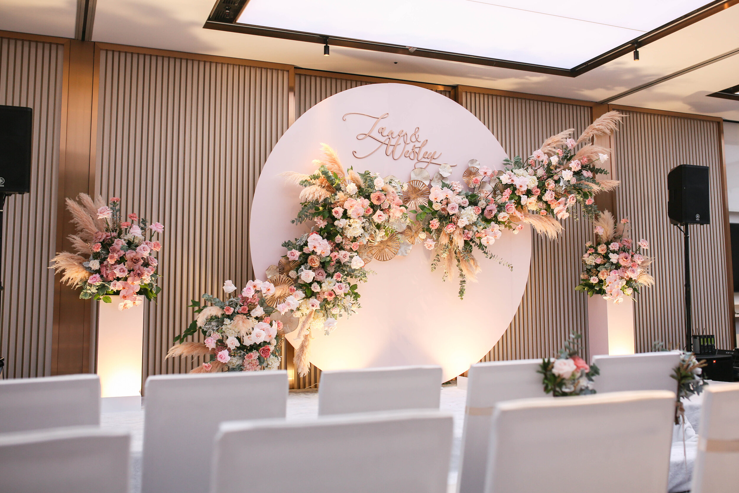 A gentle bouquet of soft pink roses, lilacs, and a touch of greenery.